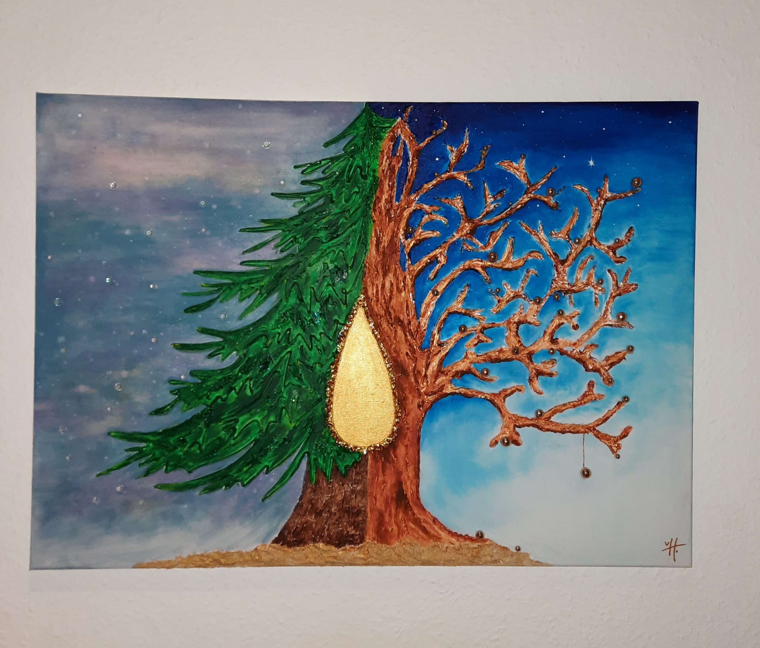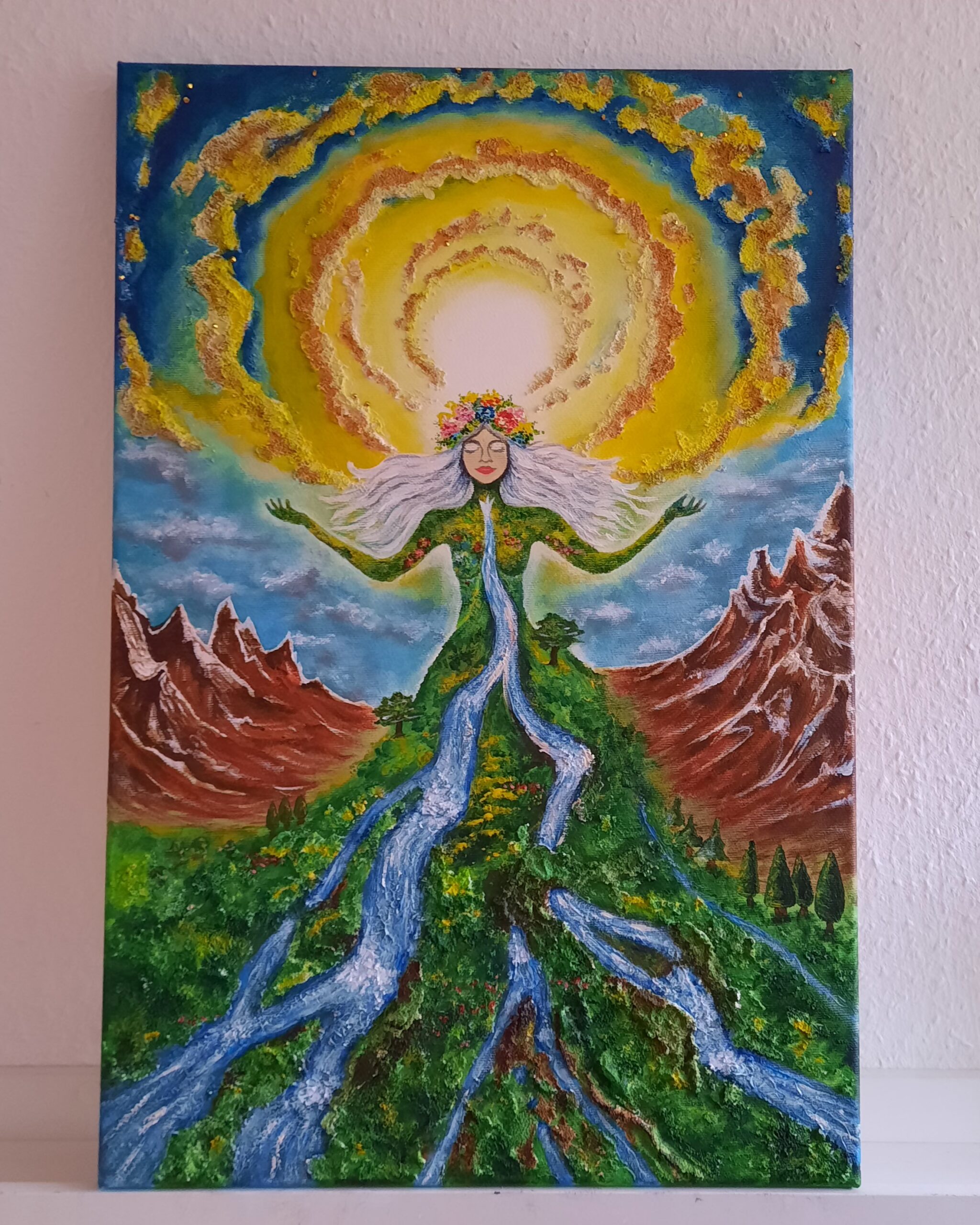 Mixed Media in Aquarell und Acryl. Mit Strukturpaste in glatt, fein und grob. Teilweise wurden kleine Steine aufgesetzt.