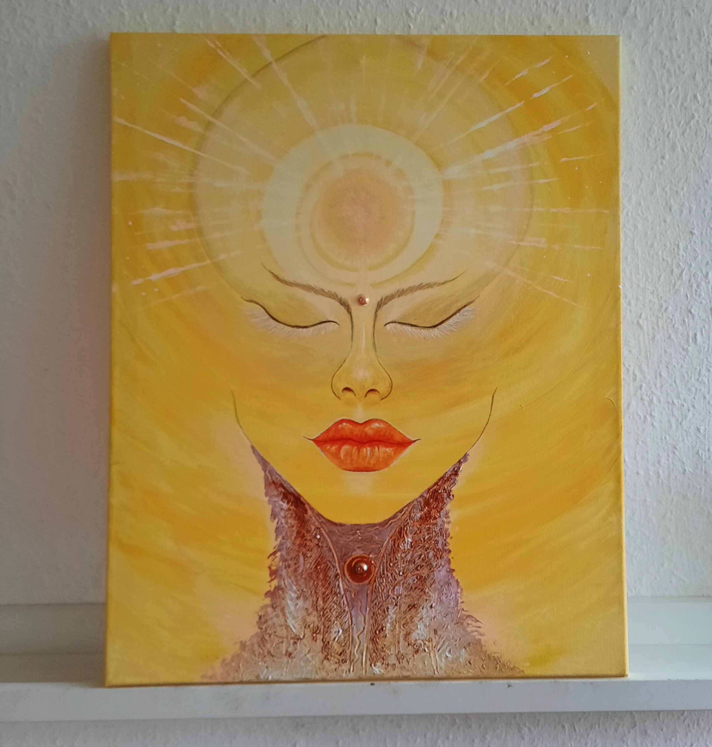 Mixed Media in Aquarell und Acryl, mit Strukturpaste, rosegold Schlagmetall und Kristallsteinchen besetzt.